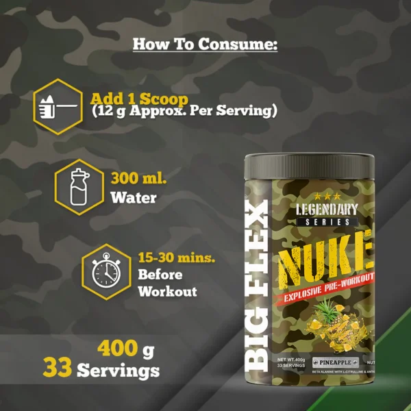 Mix 12g with water, shake well, and consume pre-workout.