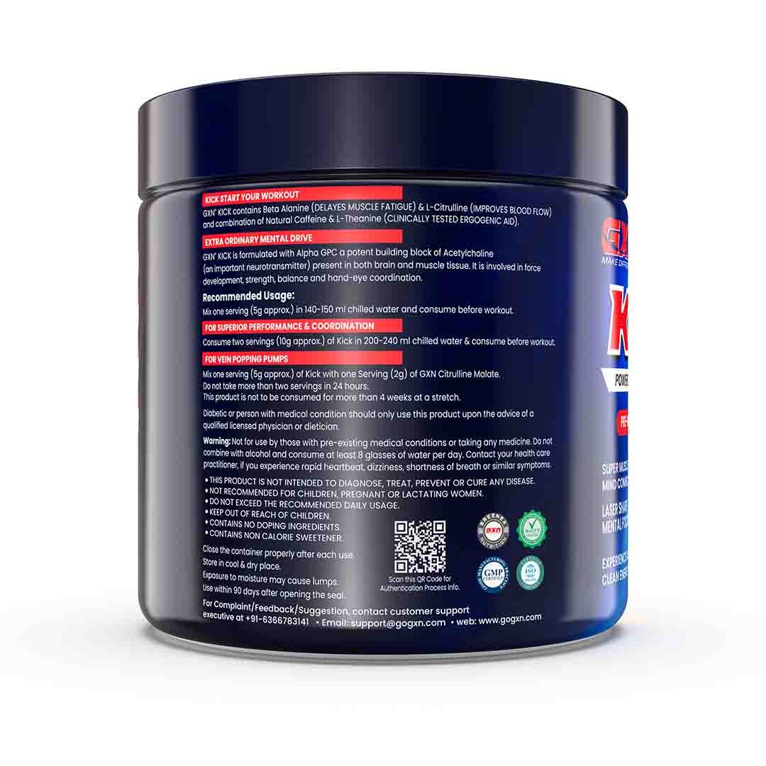 GXN KICK is your go-to pre-workout supplement for laser focus, explosive power, and improved muscle endurance to take your workouts to the next level.