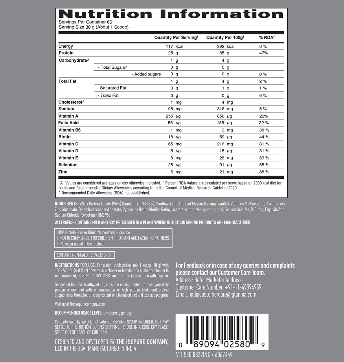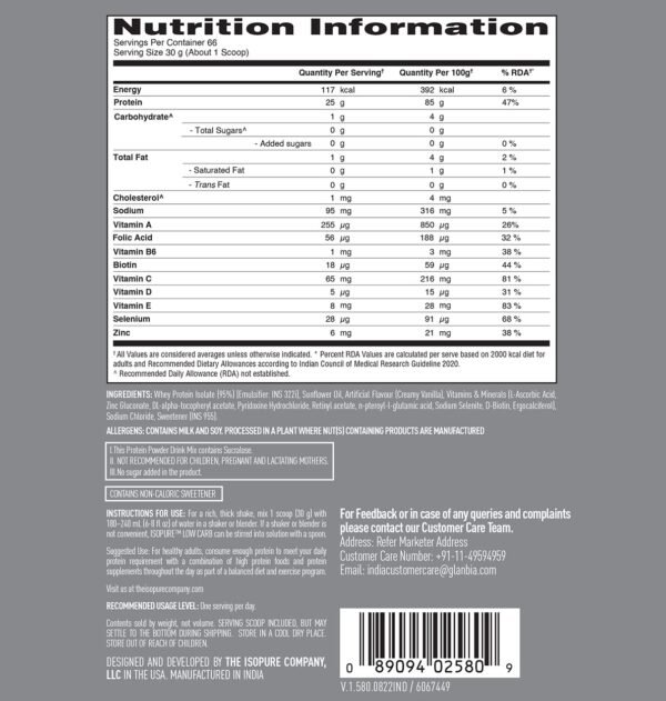 25g pure whey protein isolate per serving promotes muscle growth and recovery