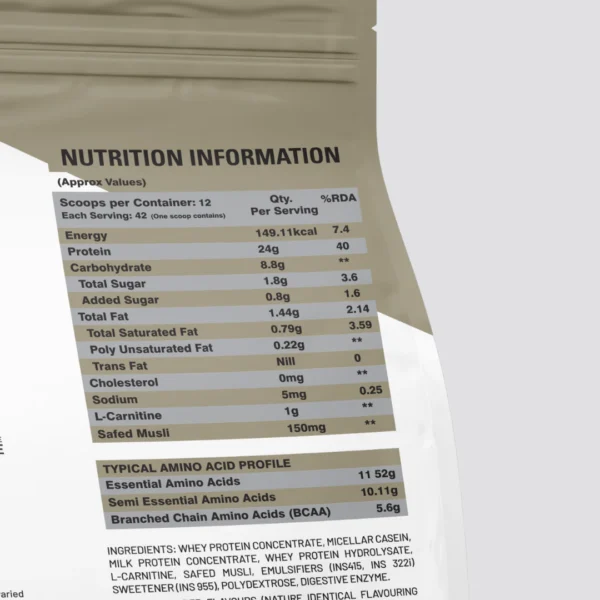 • Each serving: 24 g whey protein (concentrate + blends) plus 1 g L-carnitine and 150 mg Safed Musli to support lean gains, fat burning, and recovery, chocolate flavour.
