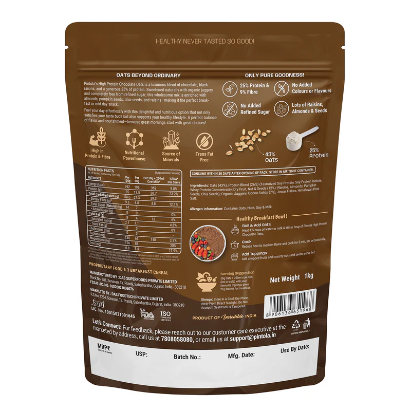 • Core ingredients: Instant oats (~43–48%), texturised soy protein and soy protein isolate (plus sometimes whey concentrate), fruit & seeds mix (raisins, pumpkin seeds, chia seeds), cocoa solids, brown sugar or organic jaggery, Himalayan pink salt, antioxidant.