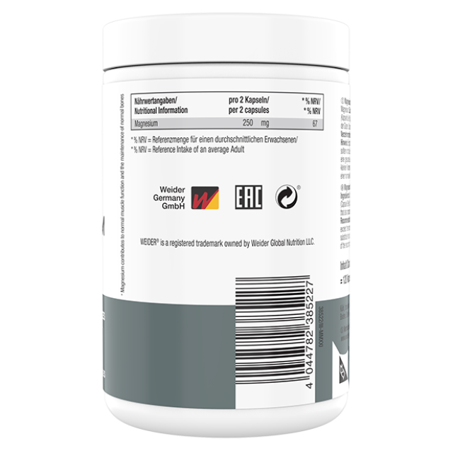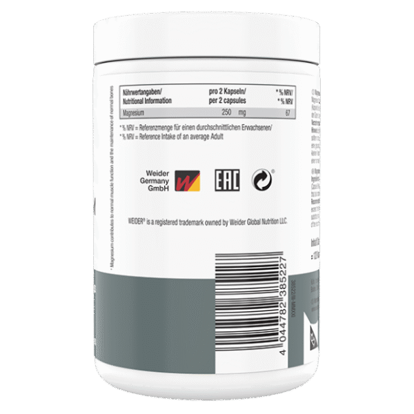 Weider Magnesium Complex combines three highly bioavailable organic forms of magnesium—magnesium malate, magnesium citrate, and magnesium bisglycinate—to provide 250 mg of elemental magnesium per serving. This premium blend ensures superior absorption, promoting muscle function, energy metabolism, and nervous system balance. Magnesium is an essential mineral involved in over 300 enzymatic reactions in the body, supporting everything from protein synthesis and muscle contraction to bone health and cardiovascular function. The capsules are vegan, free of fillers and coloring, and manufactured with high quality standards.